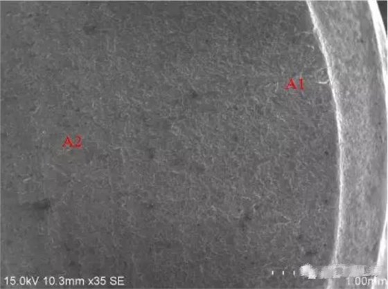 圖6~8所示為A區(qū)形貌,可見該區(qū)斷口靠近邊緣(A1區(qū))存在輪輻狀臺階,微觀可見磨損痕跡,靠近芯部(A2區(qū))可見疲勞輝紋。